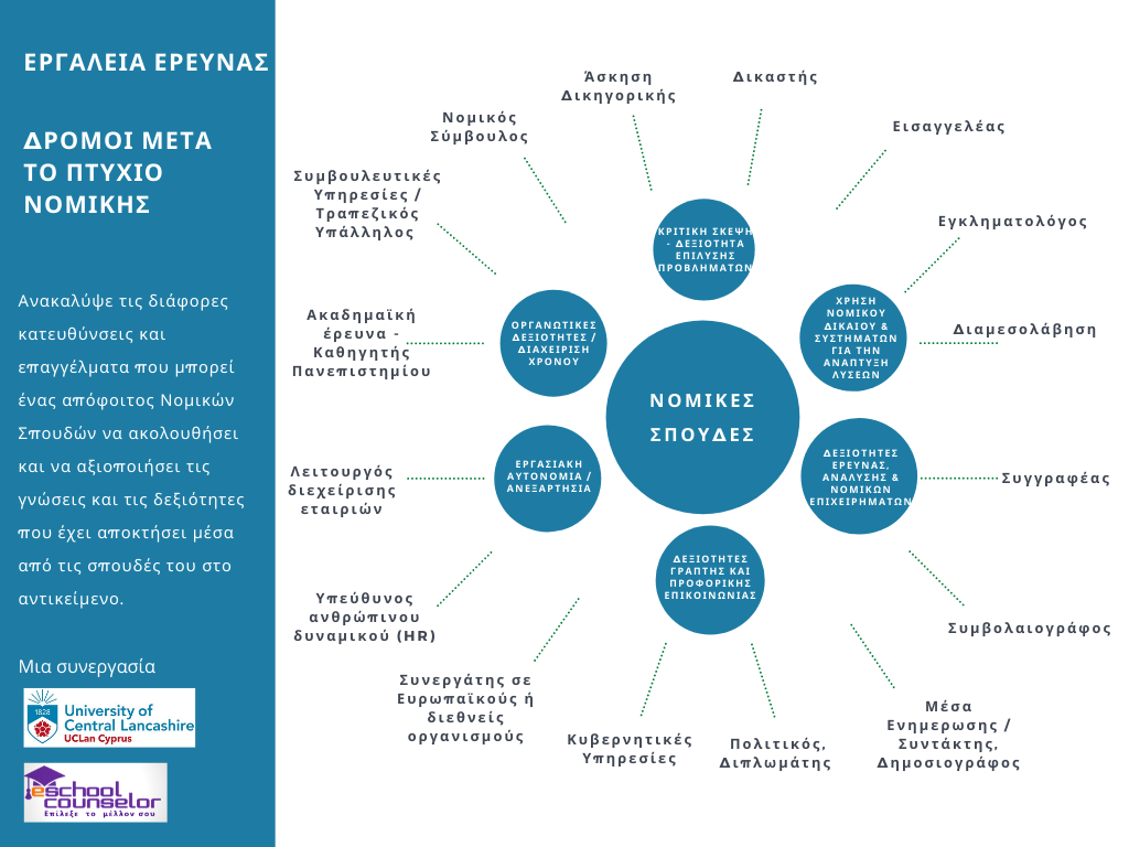 • Καλλιέργεια δεξιοτήτων έρευνας, ανάλυσης και νομικών επιχειρημάτων.